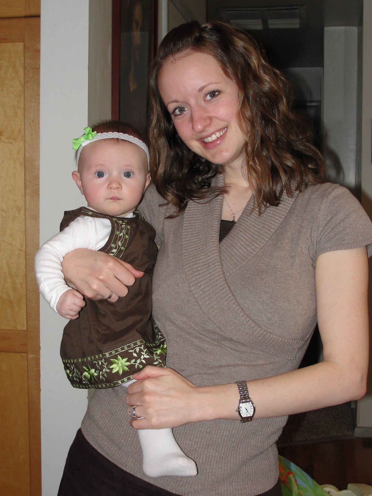 We were given the same pajamas in newborn and 6 month size, so I took a picture of her again with the same jamies and hat on to see how similar or different she looks (above at 6 mo, below at maybe 6 weeks?). Definitely similar, but she has definitely changed too. She just looks more grown up to me (and is a lot bigger, although in the pictures you can't really tell).